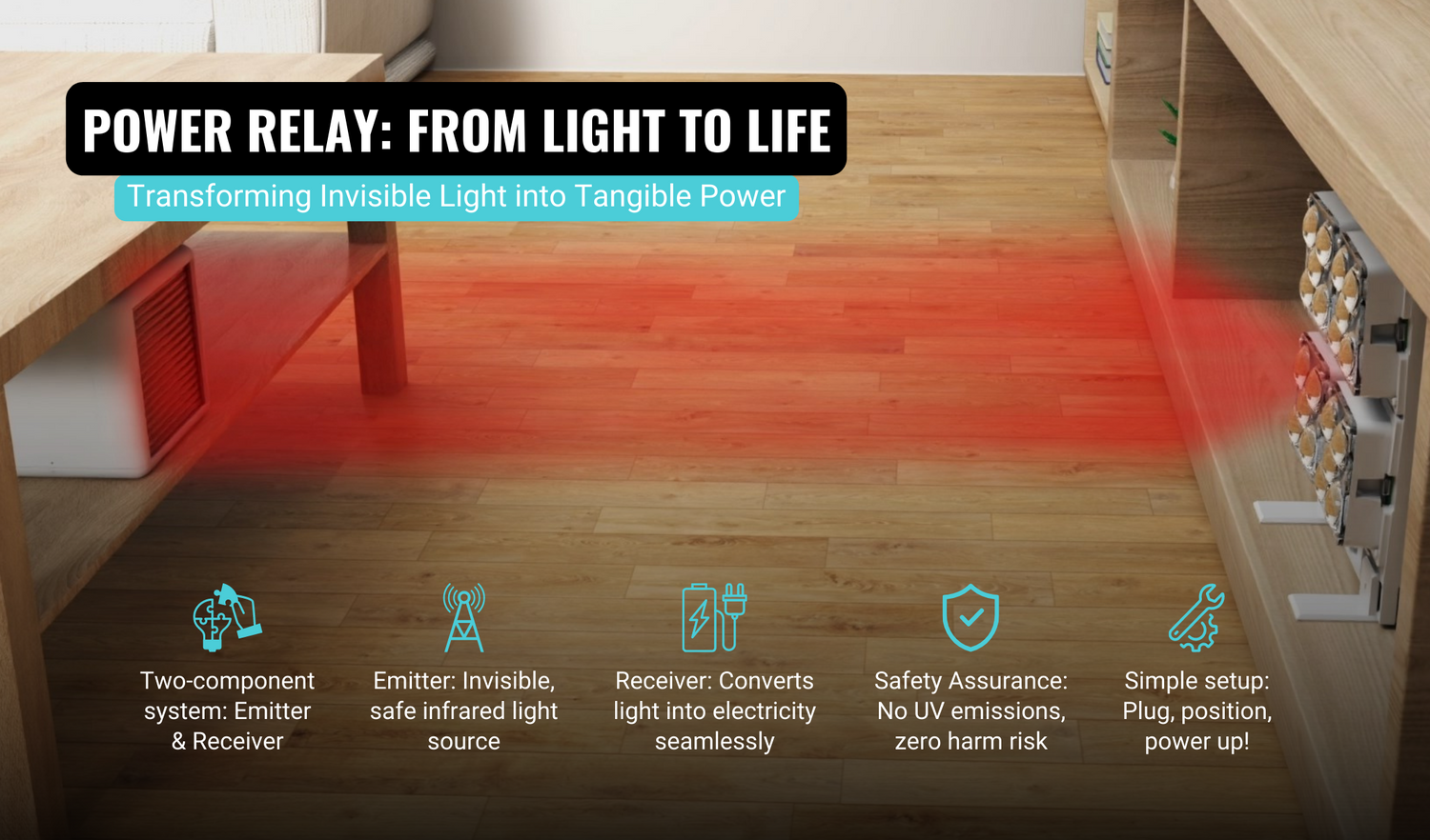 Invisible Infrared LED light emits a beam of energy towards the receiver to produce power and charge devices at a distance